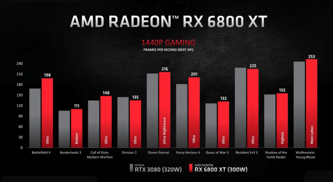 AMD parāda, ka Radeon RX 6800 XT gandrīz katrā spēlē nodrošina vairāk kadru sekundē nekā Nvidia RTX 3080, un jūs varat sagaidīt, ka lielākā daļa spēļu pat ar 4K izšķirtspēju darbosies krietni virs 60 kadriem sekundē.
